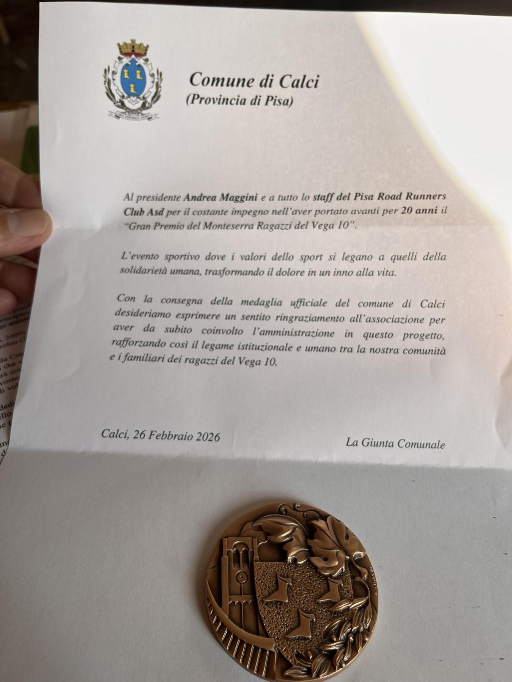 𝗔𝗹 𝗽𝗿𝗲𝘀𝗶𝗱𝗲𝗻𝘁𝗲 𝗔𝗻𝗱𝗿𝗲𝗮 𝗠𝗮𝗴𝗴𝗶𝗻𝗶 𝗲 𝗮 𝘁𝘂𝘁𝘁𝗼 𝗹𝗼 𝘀𝘁𝗮𝗳𝗳 𝗱𝗲𝗹 Pisa Road Runners club ASD per il costante impegno nell'aver portato avanti per 20 anni il “Gran Premio del MonteSerra Ragazzi del Vega 10”. L'evento sportivo dove i valori dello sport si legano a quelli della solidarietà umana, trasformando il dolore in un inno alla vita. Con la consegna della medaglia ufficiale del comune di Calci desideriamo esprimere un sentito ringraziamento all'associazione per aver da subito coinvolto l'amministrazione in questo progetto, rafforzando così il legame istituzionale e umano tra la nostra comunità e i familiari dei ragazzi del Vega 10.
